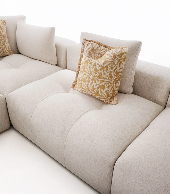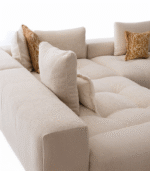 Habillé d’un tissu bouclette doux couleur crème, le salon NUBA s’impose comme une pièce centrale chaleureuse, parfaite pour recevoir ou se détendre en famille. Ses coussins assortis aux nuances naturelles, ponctués de touches dorées, ajoutent une note de raffinement et de caractère.