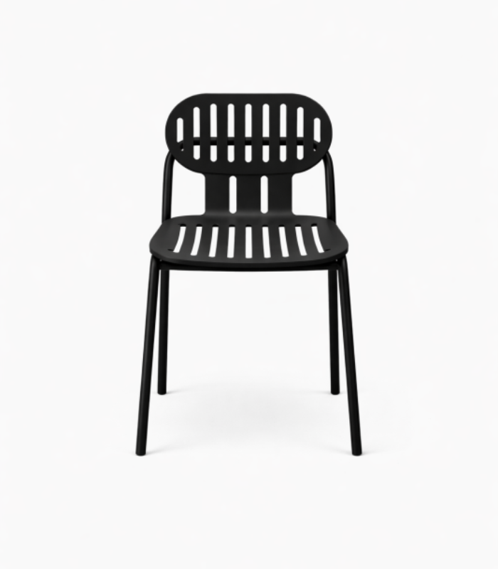 Chaise moderne noire avec dossier arrondi et assise ajourée, idéale pour une utilisation en intérieur comme en extérieur. Parfaite pour la salle à manger, la terrasse ou le jardin.