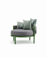 Ce fauteuil design d’Extérieur Rond design d’extérieur allie élégance moderne et confort absolu. Sa structure métallique peinte en vert lui confère robustesse et originalité, tandis que son assise ronde en tissu gris clair assure un confort optimal.
