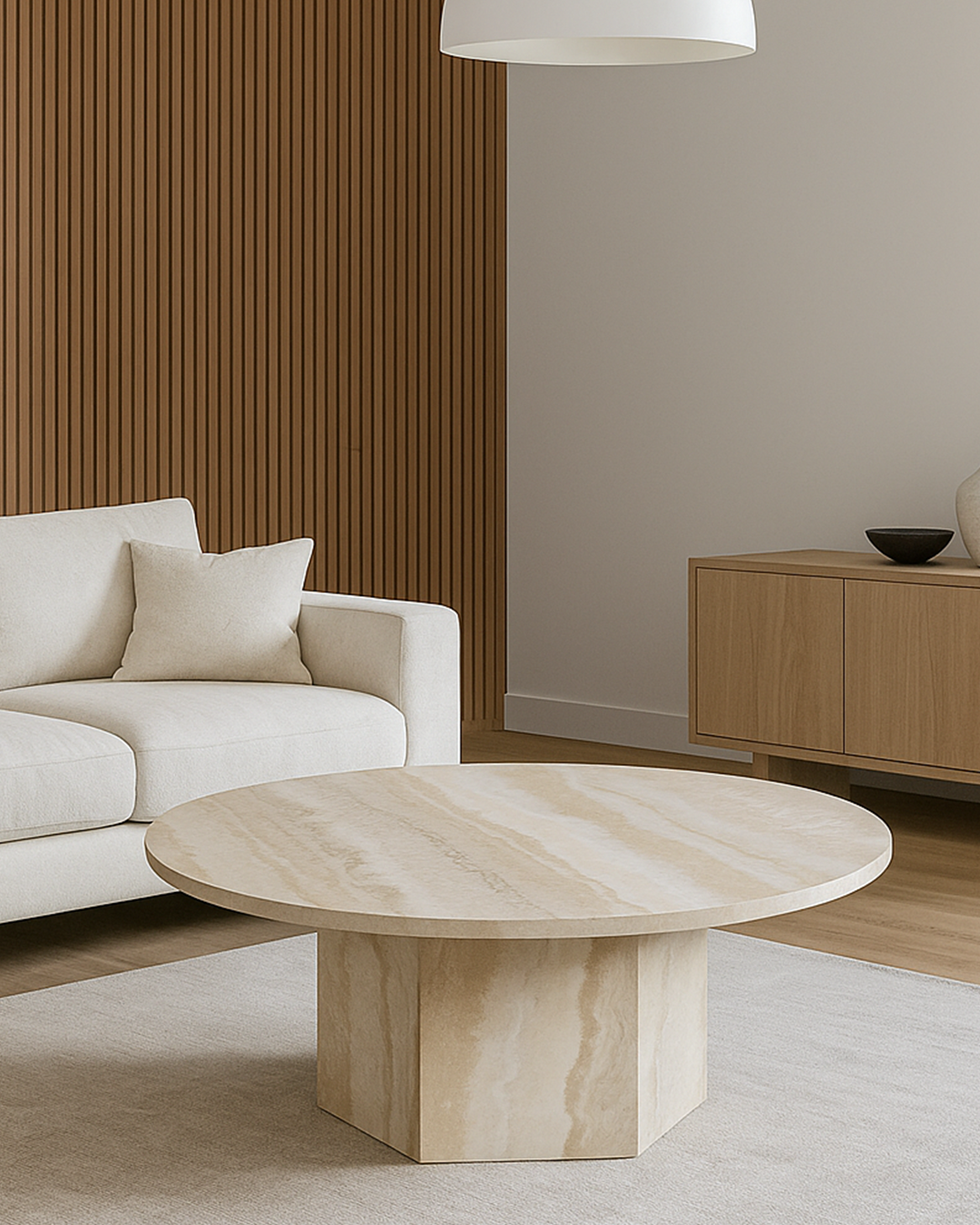 La table ronde AM en travertin est un mariage parfait entre authenticité et design contemporain. Fabriquée en pierre naturelle, elle met en valeur les nuances chaudes et les veinures uniques du travertin, offrant un style intemporel et raffiné.